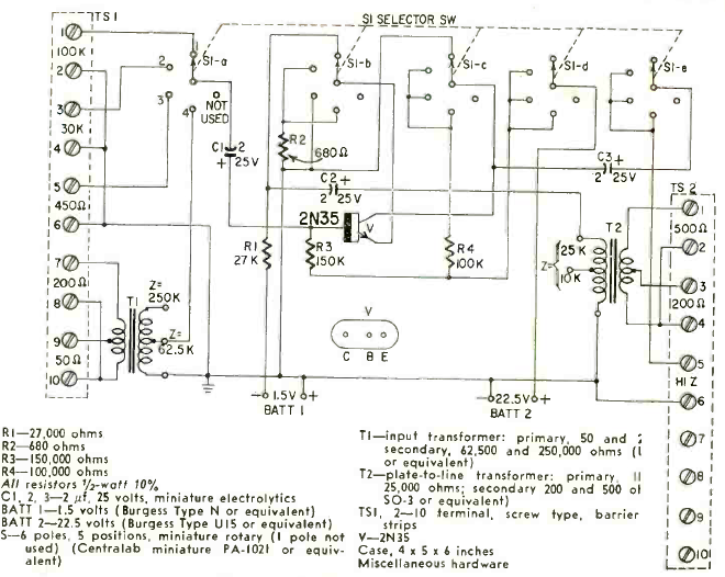 Encontramos este circuito en la revista Radio Electronics de septiembre de 1959. El circuito tiene diferentes impedancias de entrada y diferentes impedancias de salida. El circuito utiliza un solo transistor que funciona como adaptador.