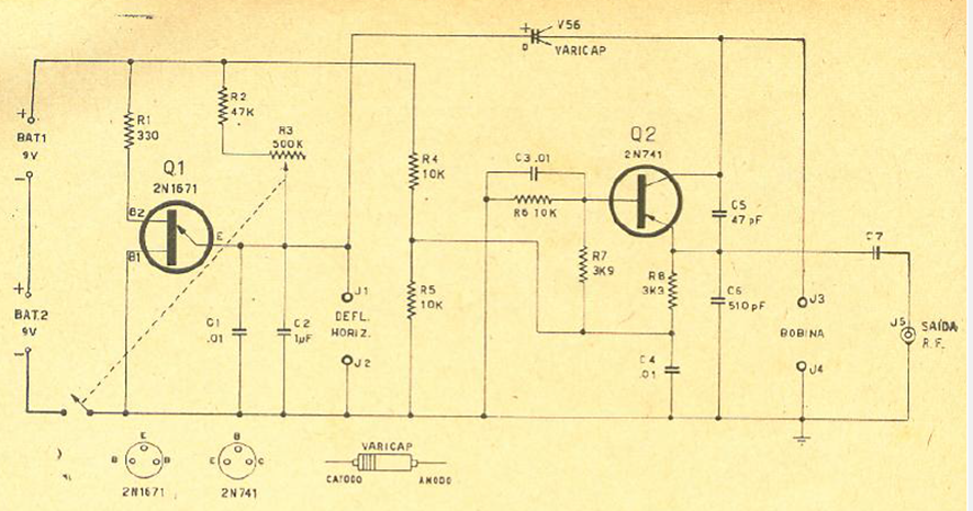 Este circuito procede de documentación de 1965. Sin embargo, se puede crear con transistores modernos. La alimentación proviene de dos baterías de 9 V.