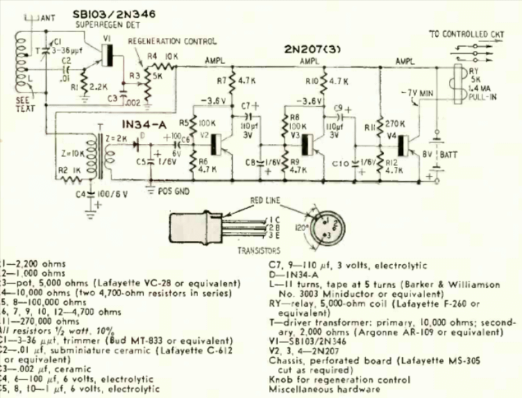 Este circuito transistorizado apareció en una revista Radio Electronics de marzo de 1958. El rango de frecuencia depende de que el circuito sintonizado esté en unos pocos megahertz.