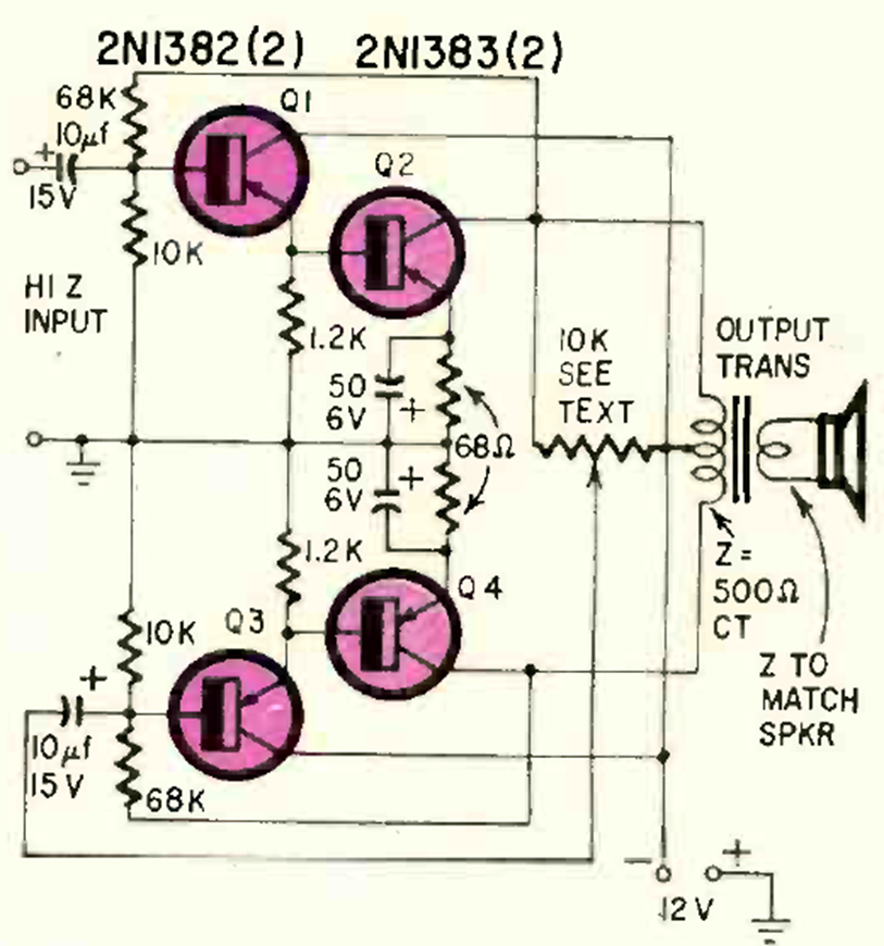 Encontramos este circuito en una Radio Electronics de octubre de 1963. El circuito utiliza un transformador de salida con una derivación central. El trimpot se ajusta para obtener una mayor ganancia y una menor corriente de reposo.