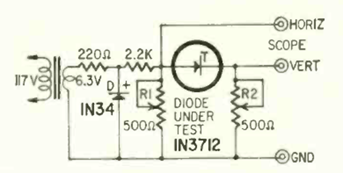 Este circuito fue encontrado en una Radio Electrónica de febrero de 1966. Con él es posible trazar la curva de un diodo túnel visualizándolo en un osciloscopio.
