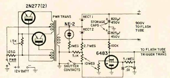 Este circuito flash electrónico comercial se encontró en la revista Radio Electronics de marzo de 1961. El circuito utiliza un transformador en una configuración elevadora de tensión.