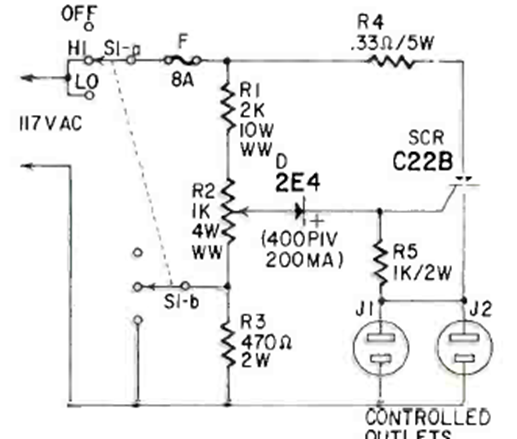 Este circuito se obtuvo de la revista Radio Electronics de junio de 1964. El SCR puede ser un tipo moderno sensible de propósito general y el diodo es del tipo rectificador. La potencia máxima depende del SCR utilizado.