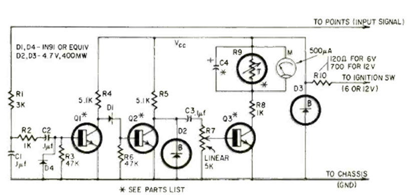 Este circuito fue encontrado en la revista Radio Electronics de septiembre de 1965. Utiliza un sistema de compensación térmica para el instrumento indicador. El circuito es para coches de época que utilizan contactos mecánicos en el sistema de encendido.