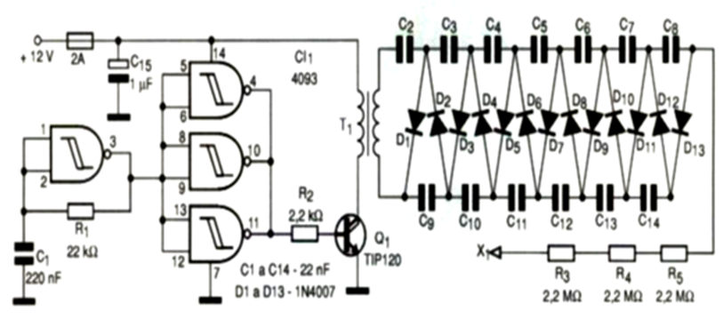 Se ha comprobado que la presencia de iones negativos en el aire de un ambiente tiene efectos beneficiosos en personas que tienen problemas respiratorios, alergias o incluso padecen dolores reumáticos o causados por quemaduras. El circuito que vemos en la figura genera una buena cantidad de iones negativos, que se esparcen por el ambiente. La alimentación de 12 V permite utilizarlo tanto en casa con fuente de alimentación como en el coche, alimentado por su batería. El circuito consta de un inversor que inicialmente eleva los 12 V de una batería o fuente de baja tensión a alrededor de 200 a 500 V, dependiendo del transformador utilizado. Esta tensión se aplica a un multiplicador de tensión que, dependiendo del número de etapas, la elevará a un valor negativo entre - 2000 y - 5000 volts. Esta tensión se aplica a un electrodo que no es más que un pin común. Debido al efecto de los picos, la carga estática generada electrifica el aire y es expulsada, sumándose así al aire ambiente. De esta forma, el aire ambiente estará lleno de iones negativos que, una vez inhalados, provocan una sensación de bienestar en las personas, aliviando especialmente las crisis alérgicas. Para comprobar que el dispositivo funciona, basta con acercar una lámpara de neón al electrodo (sin tocarlo). Debería encenderse debido al efecto de la alta tensión. El transformador puede tener un primario de 110 V o 220 V, y un secundario de 12 V con una corriente entre 200 y 500 mA. El transistor debe montarse sobre un disipador de calor. También observamos que el número de pasos del multiplicador de tensión se puede cambiar para generar mayores o menores cantidades de iones negativos.