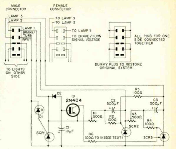 Este circuito de señal de dirección para el automóvil se encontró en la revista Radio Electronics de abril de 1969. El circuito utiliza transistores unijuntura programables para accionar lámparas incandescentes.