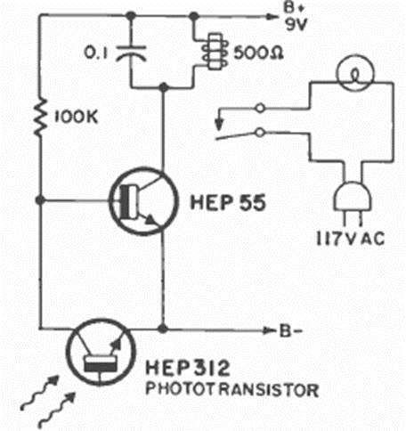 Este circuito se encontró en una revista de Radio Electronics de abril de 1971. La resistencia de 100 k se puede reemplazar por una resistencia de 10 k en serie con un trimpot de 1 M para obtener un ajuste de sensibilidad.