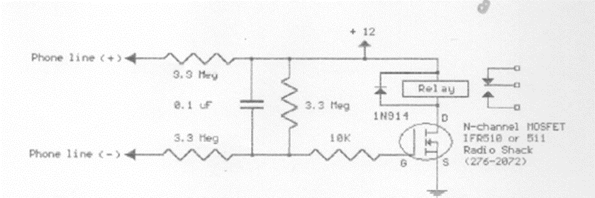 Este circuito para teléfonos analógicos antiguos procede de documentación de la época. Controla un relé que se puede utilizar para encender y apagar el cable de extensión.