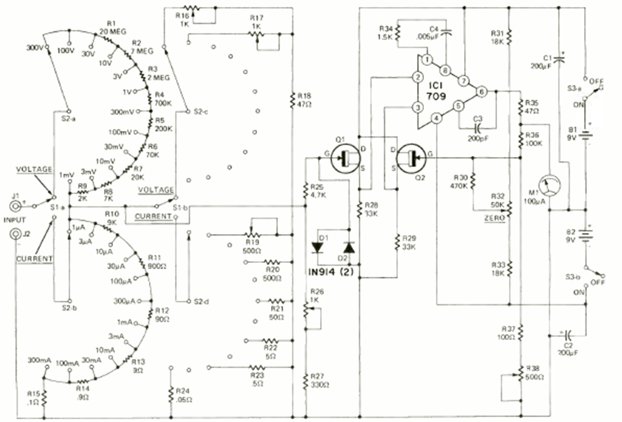 Este multímetro con FET y amplificador operacional 709 fue encontrado en la revista Radio Electronics de julio de 1972. El circuito utiliza dos baterías de 9 V en una fuente simétrica y el indicador es un microamperímetro de 100 uA.