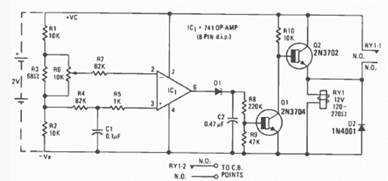 Recomendado para aplicaciones de alarma, este circuito es una modificación del anterior. Lo encontramos en la revista Radio Electronics de diciembre de 1976. El circuito es para coches con baterías de 12 V.