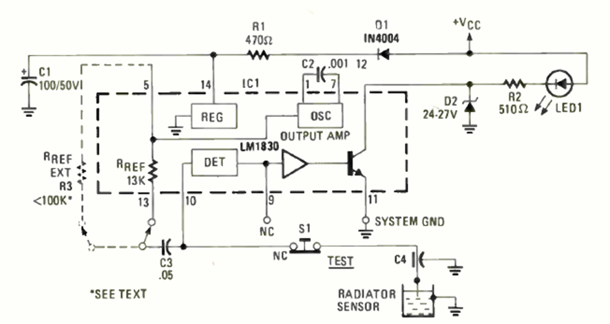Hallado en la revista Radio Electronics de octubre de 1979, el propósito de este circuito es monitorear el nivel de refrigerante en el radiador del automóvil. El circuito está basado en el LM1830.