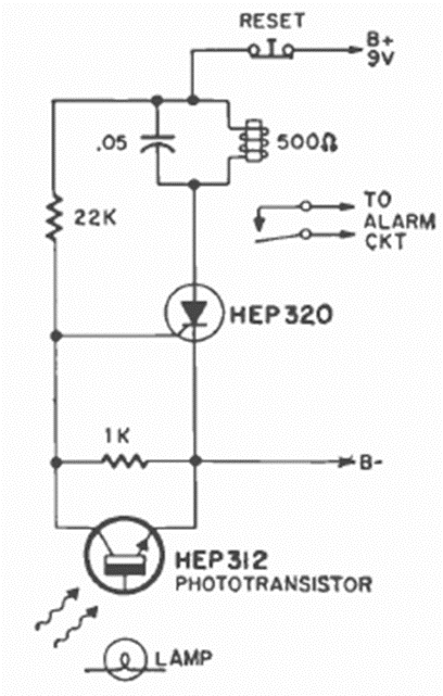 Esta alarma de paso se encontró en la revista Radio Electronics de abril de 1971. En lugar de R1, se puede usar un potenciómetro de 47k para ajustar la sensibilidad según el fototransistor utilizado.