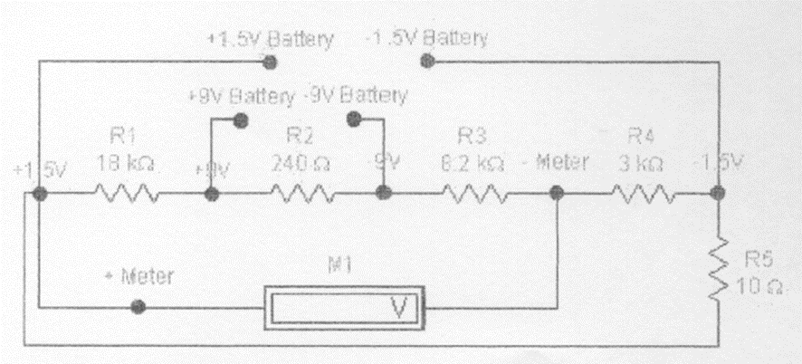 Este circuito lo encontramos en documentación de los años 90. En lugar del voltímetro, se puede utilizar la escala de tensión del multímetro. El circuito prueba las baterías bajo carga.