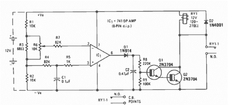 Recomendado para aplicaciones de alarma, este circuito se encontró en la revista Radio Electronics de diciembre de 1976. El circuito es para aplicaciones en automóviles de 12 V.