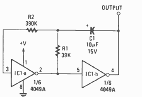 Esta es una de las muchas versiones de este oscilador que tenemos en nuestra web. Lo encontramos en un artículo de la revista Radio Electronics de enero de 1987. La frecuencia depende de C1.