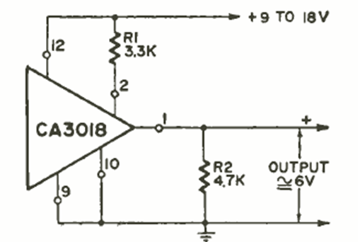 Este circuito lo encontramos en la revista Radio Elecronics de agosto de 1970. Utiliza el circuito integrado CA3018 lanzado en su momento por RCA. El pr interno Q3 y Q4 internos del CI funcionan como un zener.