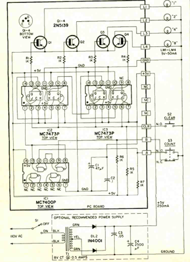 Este circuito de enseñanza TTL apareció en la revista Radio Electronics de febrero de 1972. Se suministra alimentación de 5 V y se utilizan lámparas indicadoras. El circuito es de 4 bits.