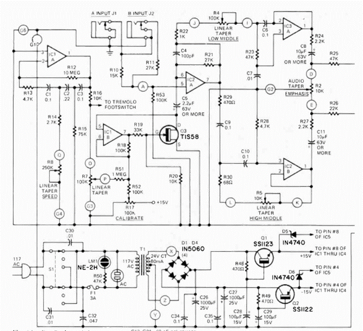 Este circuito es de un artículo aparecido en la revista Radio Electronics en junio de 1974. El circuito utilizaba circuitos integrados y transistores de la época, incluida la fuente de alimentación.