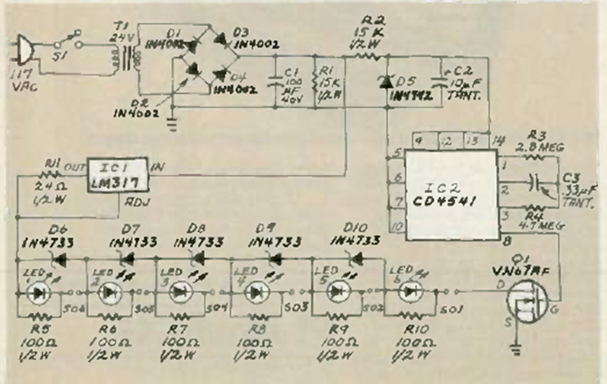 Este circuito es de la revista Radio Electronics de septiembre de 1985. El circuito tiene un indicador de carga mediante LED y está basado en lógica CMOS. El MOSFET debe estar equipado con un radiador de calor.