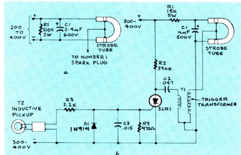 Lo encontramos en la revista Radio Electronics de mayo de 1987. Dispara una lámpara de xenón desde un sensor inductivo. El circuito necesita de 200 a 400 V CC para funcionar.