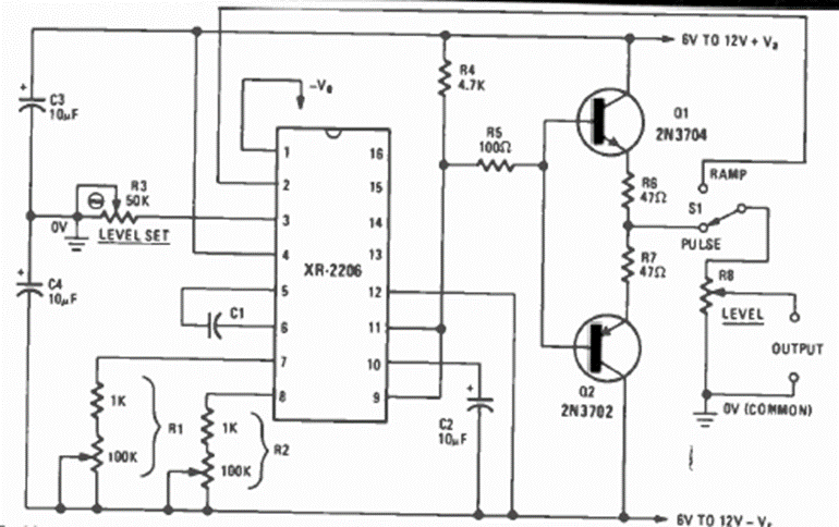 Este interesante circuito de banco fue encontrado en la revista Radio Electronics de mayo de 1977. El circuito tiene ajuste de frecuencia y la forma de onda se selecciona mediante un interruptor.