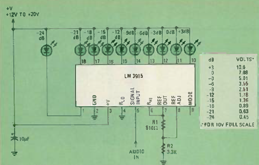 Este indicador de nivel de audio fue encontrado en la revista Radio Electronics de octubre de 1980. Observa la tabla con los valores en dB de las señales indicadas.