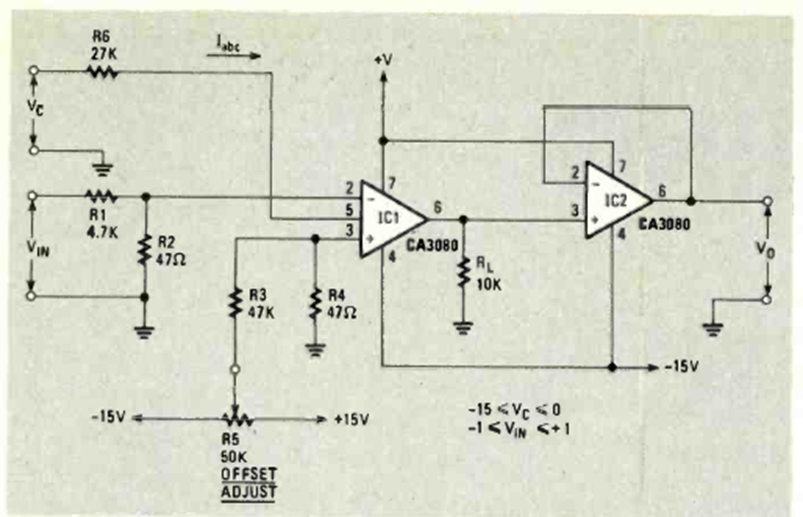 Este circuito amplificador con una ganancia entre 0 y 96 se encontró en la revista Radio Electronics de diciembre de 1983. La fuente de alimentación debe alimentarse con una tensión de 15 V.