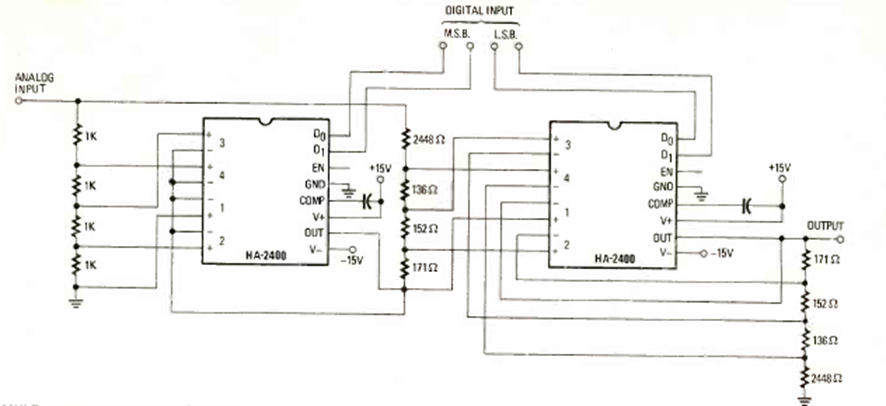 Este circuito convertidor de digital a analógico se encontró en la revista Radio Electronics de marzo de 1980. La fuente de alimentación debe ser simétrica y los controles digitales pueden ser TTL.