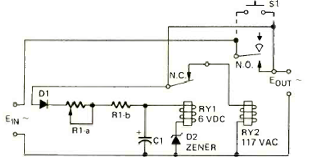 Este circuito utiliza dos relés que conmutan cuando ela tensión excede el valor dado por el zener D2. El circuito es de una revista Radio Electronics de abril de 1975.