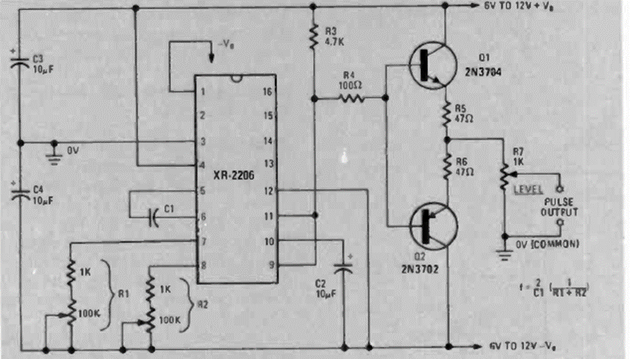 Encontramos este circuito en la revista Radio Electronics de mayo de 1977. El circuito tiene la frecuencia dada por los componentes según la fórmula al lado del diagrama.