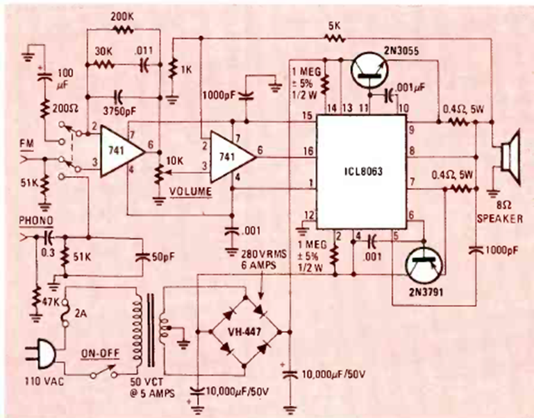 Este amplificador de 50 W fue encontrado en Radio Electronics en noviembre de 1983. El circuito es adecuado para el caso e incluye un preset con control de tono utilizando componentes comunes.