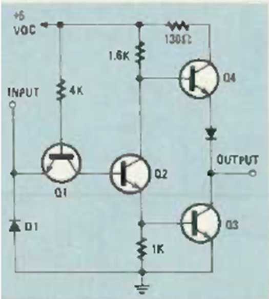 Esta es la versión de transistor común de una puerta inversora TTL. Los transistores son de uso general y deben alimentarse con 5 V.