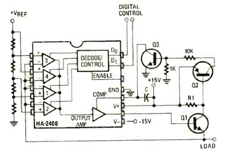 Utilizando el HA2400, este circuito tiene su tensión de salida programado digitalmente en base a las referencias dadas por la red de resistencias. El circuito es de una Radio Electrónica de marzo de 1980. La fuente debe ser simétrica.