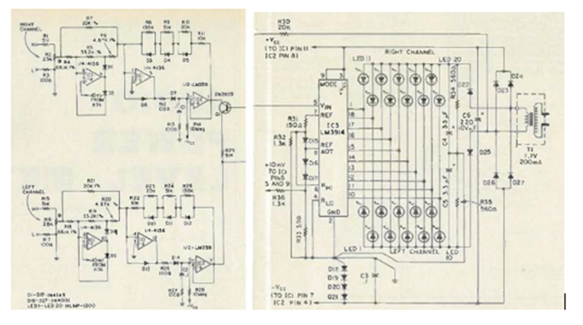 Este circuito se encontró en la revista Radio Electronics de febrero de 1980. El circuito digital se mostró en dos partes, utilizando 20 LED en una configuración con el LM3914.