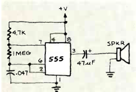 Este oscilador simple puede usar altavoces de 8 ohmios o cerca. El circuito es de una Radio Electrónica de mayo de 1982. La frecuencia se puede modificar cambiando el resistor de 1 M.