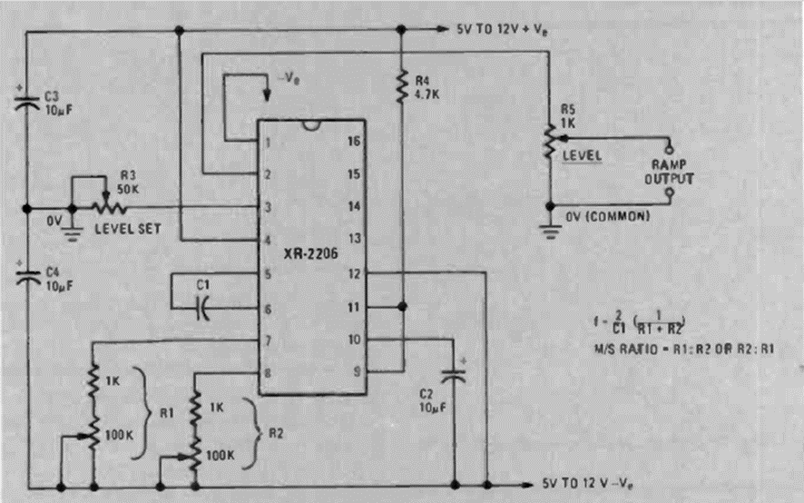 Usando el XR2206, este circuito se encontró en la revista Radio Electronics de mayo de 1977. La fórmula al lado del diagrama da los valores de los componentes en función de la frecuencia.