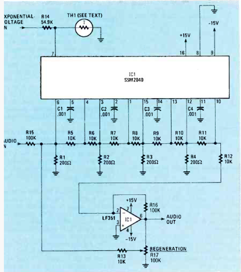 Este circuito se encontró en la revista Radio Electronics de mayo de 1983. El circuito integrado SSM7046 es un tipo especial para este propósito y es muy sensible a los cortocircuitos que requieren una fuente de alimentación simétrica.