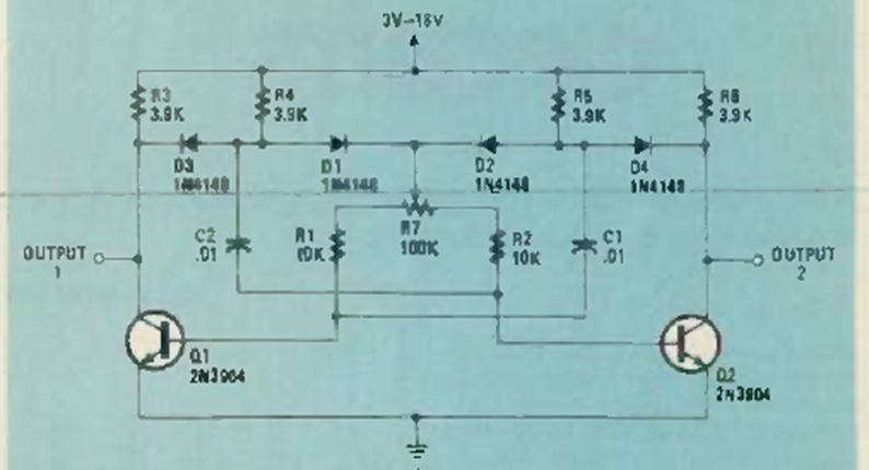 Este circuito fue encontrado en la revista Radio Electronics de septiembre de 1984. La frecuencia la dan los capacitores. Los diodos ayudan en el proceso de arranque.