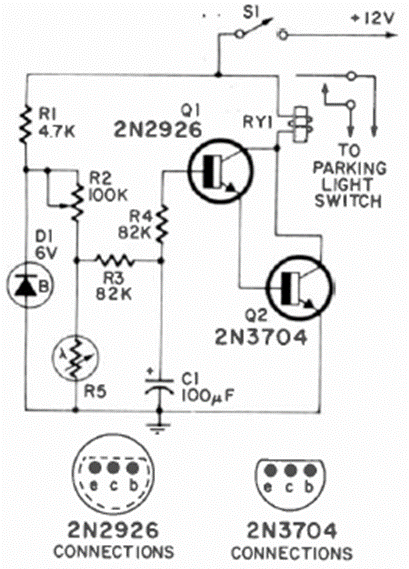Este circuito automotriz fue encontrado en la revista Radio Electronics de abril de 1971. El relé es de 12 V y la frecuencia de los parpadeos se determina ajustando R2.