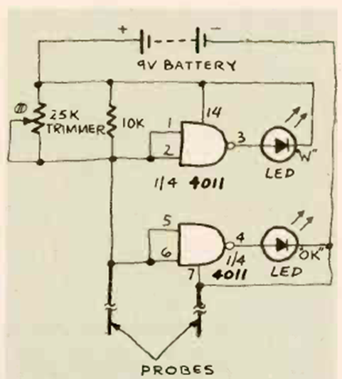 En la figura tenemos el circuito de un sensor de humedad simple con el 4011. El circuito fue encontrado en la revista Radio Electronics de enero de 1981. Es conveniente colocar resistores limitadores de 1 k en serie con los LED.