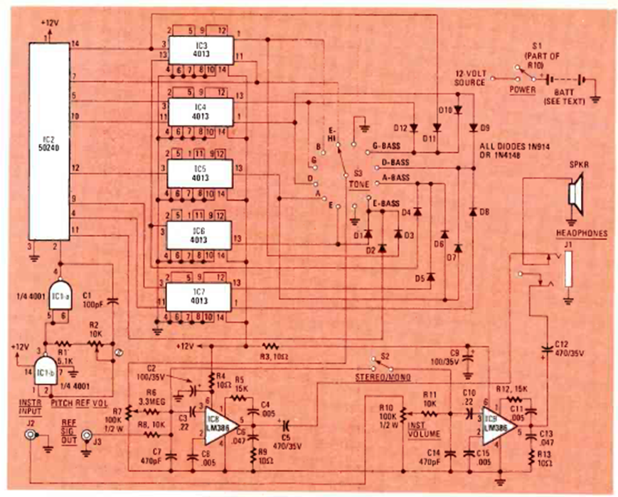 Este estándar de frecuencia para afinar guitarras y otros instrumentos musicales se encontró en la revista Radio Electronics de noviembre de 1982. Utiliza un oscilador con divisores de frecuencia. Los componentes todavía se pueden encontrar.
