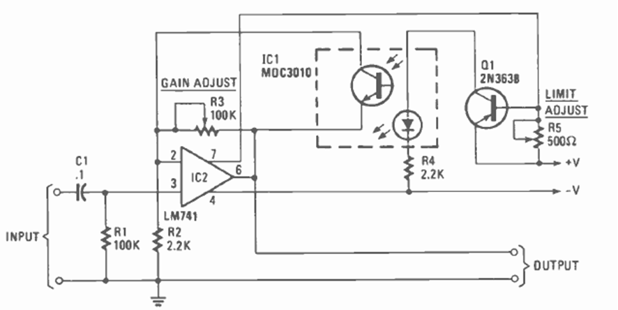 Este circuito sirve para proteger un amplificador contra un exceso de potencia de salida que causaría problemas con los altavoces. El circuito es de la revista Radio Electronics de enero de 1985.