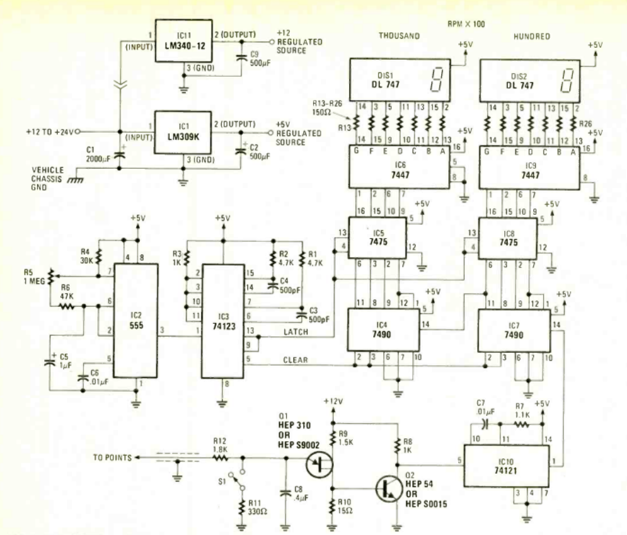 Encontramos este circuito en la revista Radio Electronics de abril de 1978. El circuito de 2 dígitos utiliza integrados TTL comunes y debe alimentarse con una tensión de 5 V.