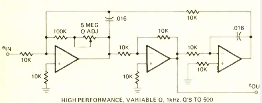 Este circuito de filtro variable se encontró en la revista Radio Electronics de julio de 1975. El circuito utiliza 3 operaciones de propósito general como el 741 y debe usar una fuente simétrica.