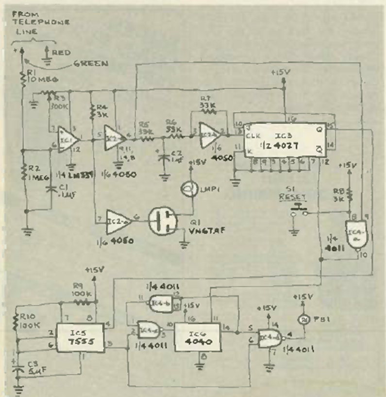 Este circuito para teléfonos antiguos fue encontrado en la revista Radio Electronics de julio de 1985. Activa una alarma si el teléfono se ha quedado descolgado.