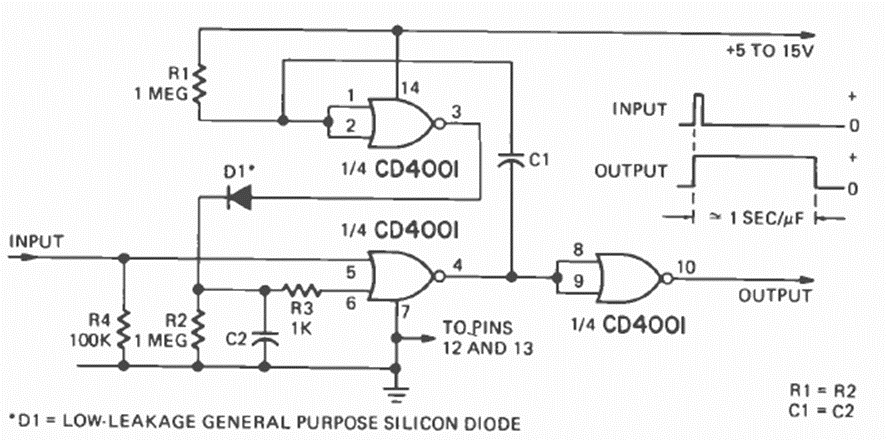 Este multivibrador con el 4001 se encontró en la revista Radio Electronics de noviembre de 1974. El diodo puede ser cualquier diodo de silicio de propósito general y el tiempo está dado por R1, R2, C1 y C2.