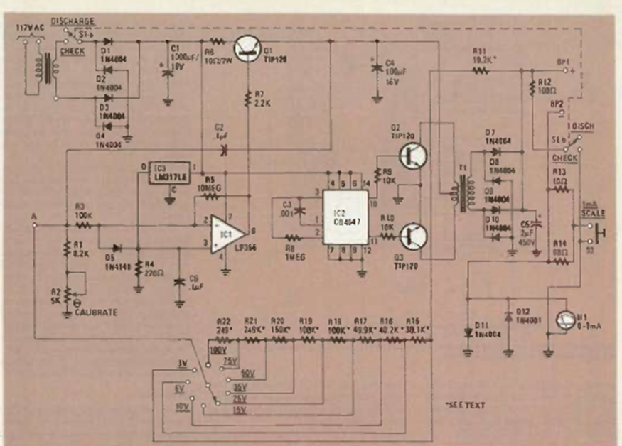 Este circuito es de una revista de Radio Electronics de mayo de 1986. Observe los voltajes aplicados a los capacitores, teniendo cuidado de que el capacitor bajo prueba los soporte.