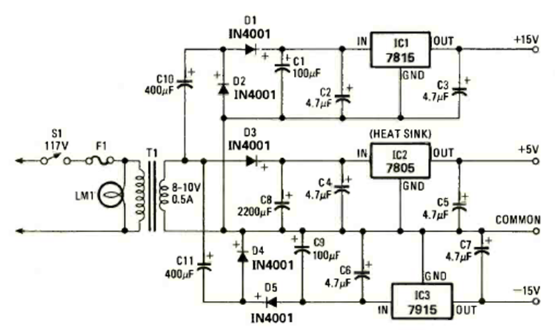 Para alimentar circuitos con operativa y TTL, la revista Radio Electronics de marzo de 1978 recomienda esta fuente. La corriente máxima es de 1 A y los circuitos integrados deben estar equipados con disipadores de calor.