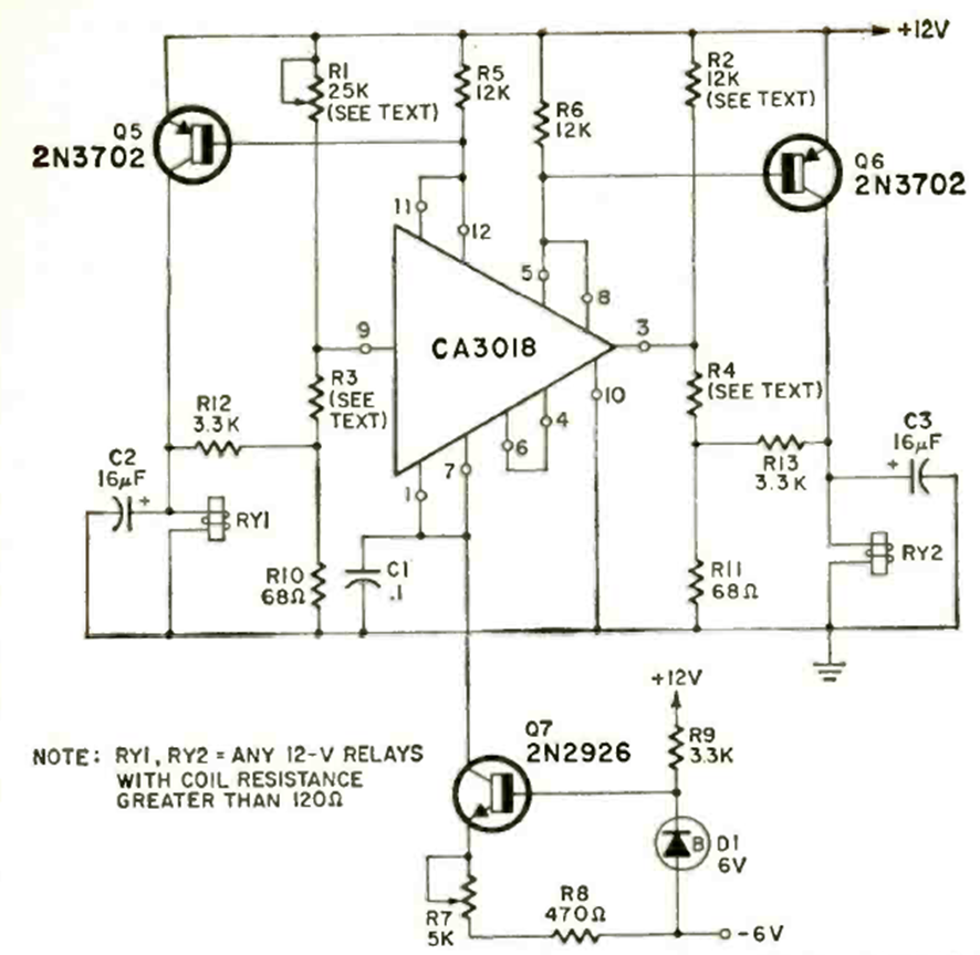 Encontramos este circuito en la revista Radio Electronics de octubre de 1970. Utiliza el entonces nuevo circuito integrado CA3018 de RCA. Algunos resistores deben estar pareados para obtener el mejor rendimiento.