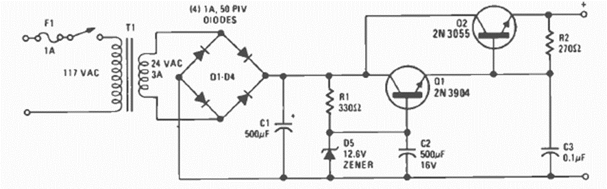 Para alimentar proyectos pequeños encontramos este circuito en la revista Radio Electronics de mayo de 1977. El transistor debe estar equipado con un disipador de calor.
